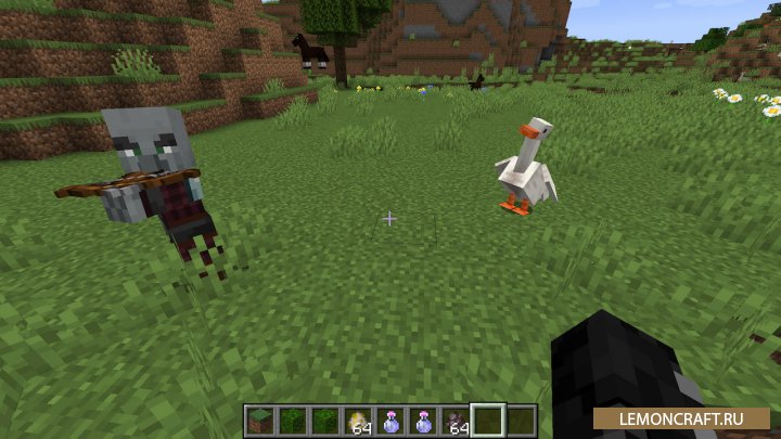 Мод на уток и гусей Untitled Duck добавляет в игру новых персонажей, уток и гусей, а так же несколько предметов непосредственно связанных с ними. Уток вы сможете разводить используя семена, а с самих уток получите перья. Так же утки умеют плавать, а если рядом с ними включить проигрыватель, начнут танцевать. Гусей так же можно разводить семенами, а приручать с помощью водорослей. Гуси отпугивают обитателе, как кошки криперов, а так же могут, как в реальной жизни, напасть на вас и выхватить находящийся у вас в руках предмет.